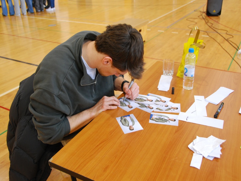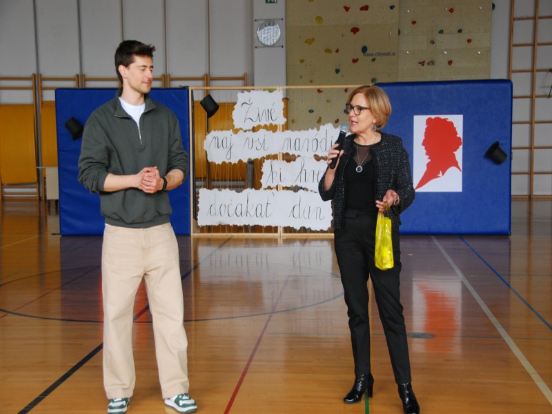 Pred njegovim prihodom so osmošolci in devetošolci deklamirali Prešernovega Povodnega moža in Zdravljico, plesalke pa so odplesale ples na naslovno skladbo serije Skrito v raju. Mladi igralec nam je predstavil svoje skrajno zanimivo življenje. Z igro se je prvič srečal pri štirih letih, ko je na predstavi dedka Mraza opazoval igralce na odru in njihovo igro. Že kot osnovnošolec je igral v filmu Gremo mi po svoje, ko pa je odrasel, je nastopil v številnih serijah in filmih, kot so Najini mostovi, Posledice, Gajin svet 2, Gospod profesor in v nam zelo znani seriji Skrito v raju.