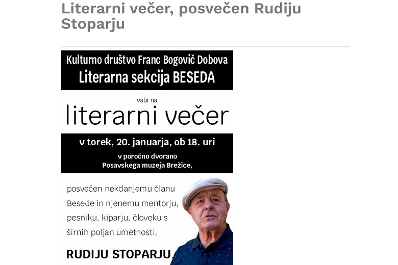 Dogodek bo posvečen nekdanjemu članu Besede in njenemu mentorju, pesniku, kiparju, človeku s širnih poljan umetnosti, RUDIJU STOPARJU.