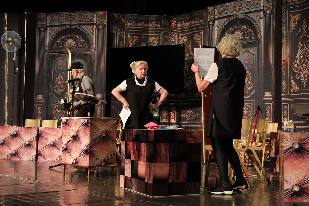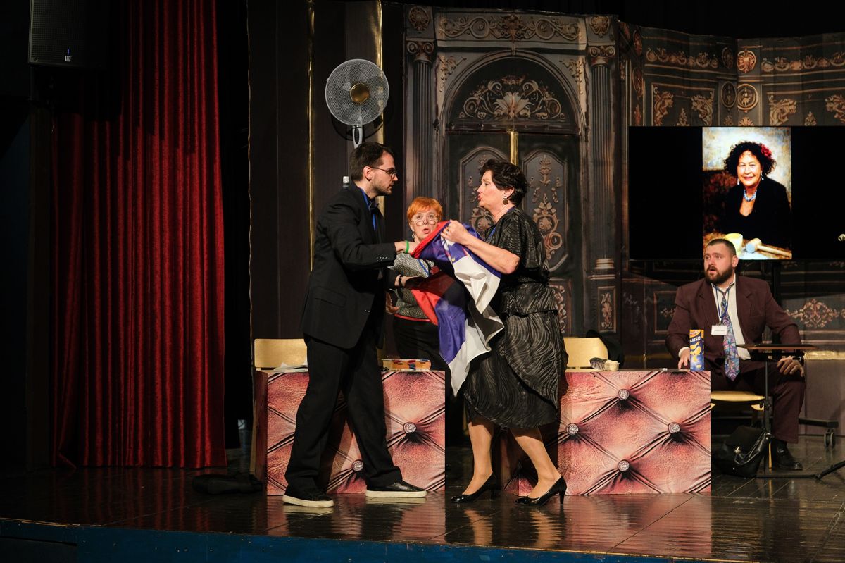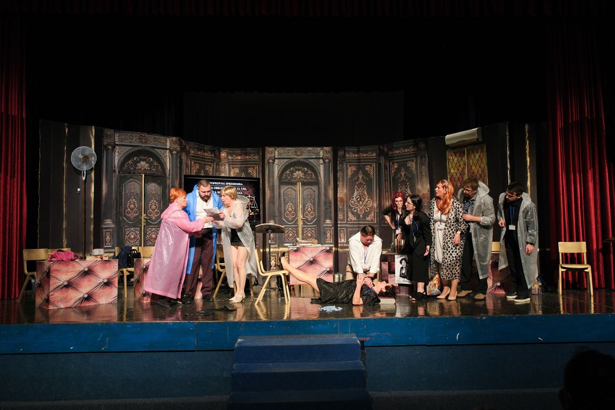 V predstavi nastopajo Milanka Hojnik (Ernestina Molk), Aleksandra Macur in Mojca Brilej Behin (Tilka Močnik Burger), Marjan Poznič (Živko Kregar), Alenka Poznič (Vera Kovač), Tilen Abram (Janez Novak), Tim Žveglič (Ljubo Cmer), Darja Boh (Žarka Smuk), Zvonko Marinič (Tinko Marinko), Kaja Žvar (Vladka Rop), Vlasta Moškon (Milojka Čuden), Branko Margon (Bine Rednik), Beba Urbančič (Berta), Darija Jesenšek in Marjana Abram (Silvija), Mirela Zalokar (Marija Jan), Anja Brilej Bohorč (Vanesa Palegrini) ter Boštjan Colarič (Erik Razkriva).