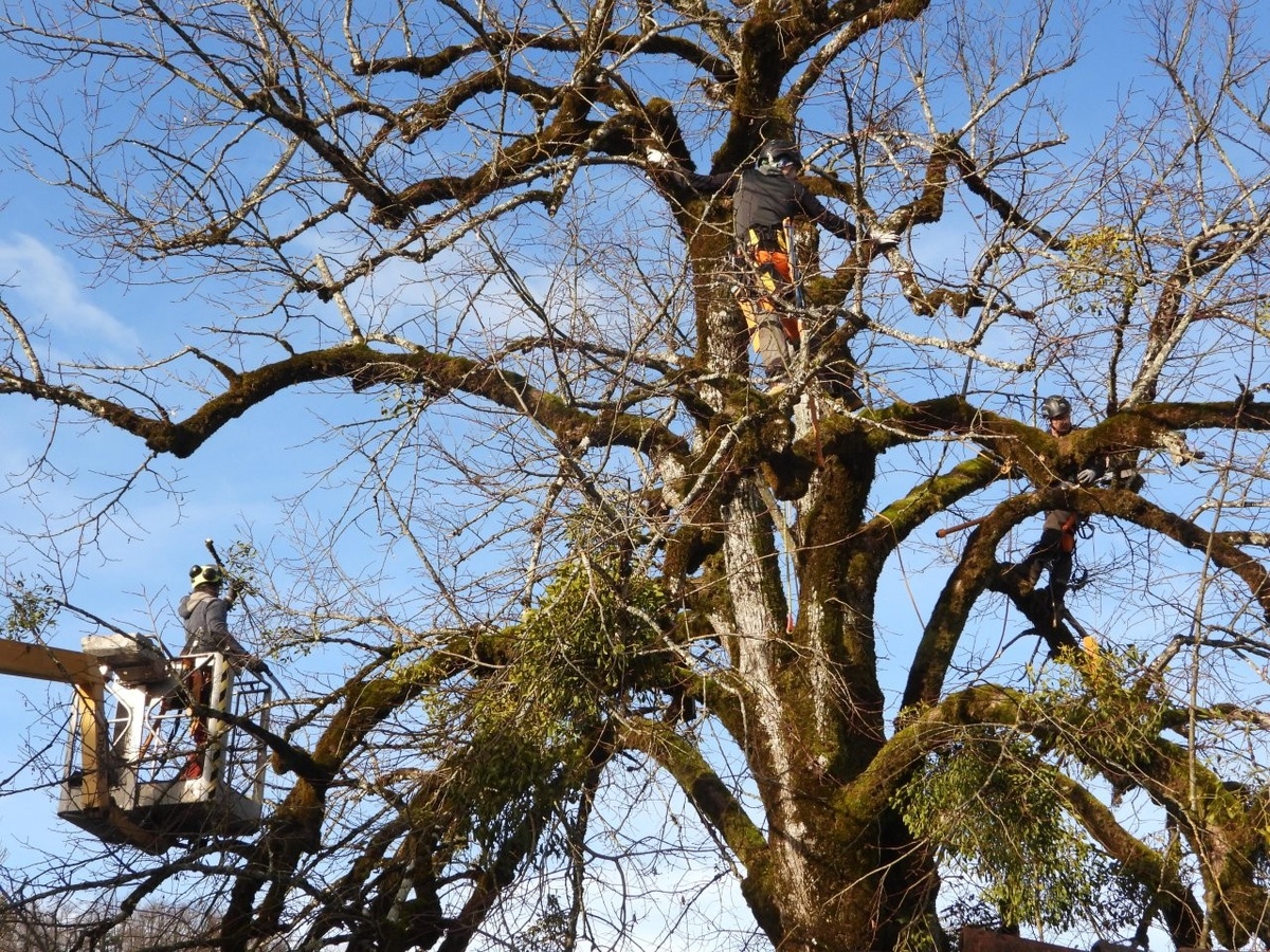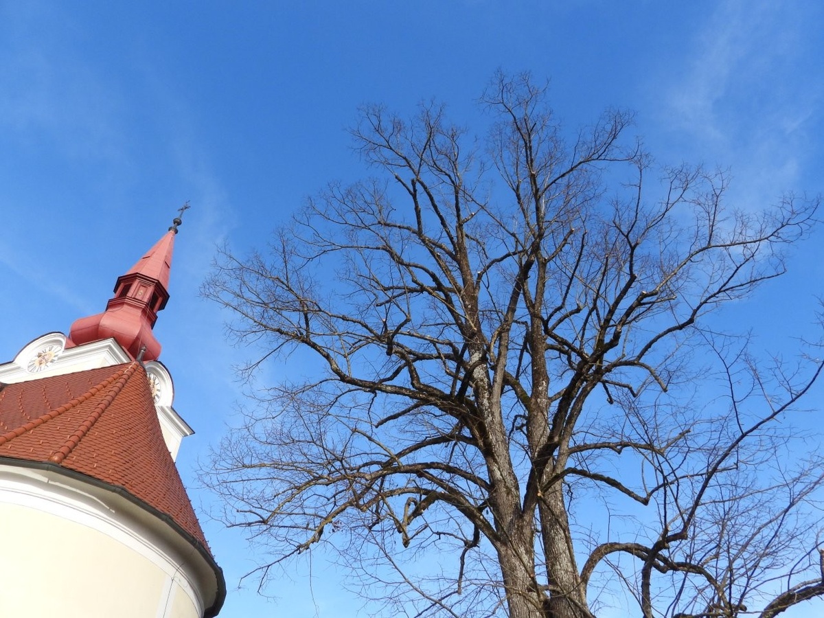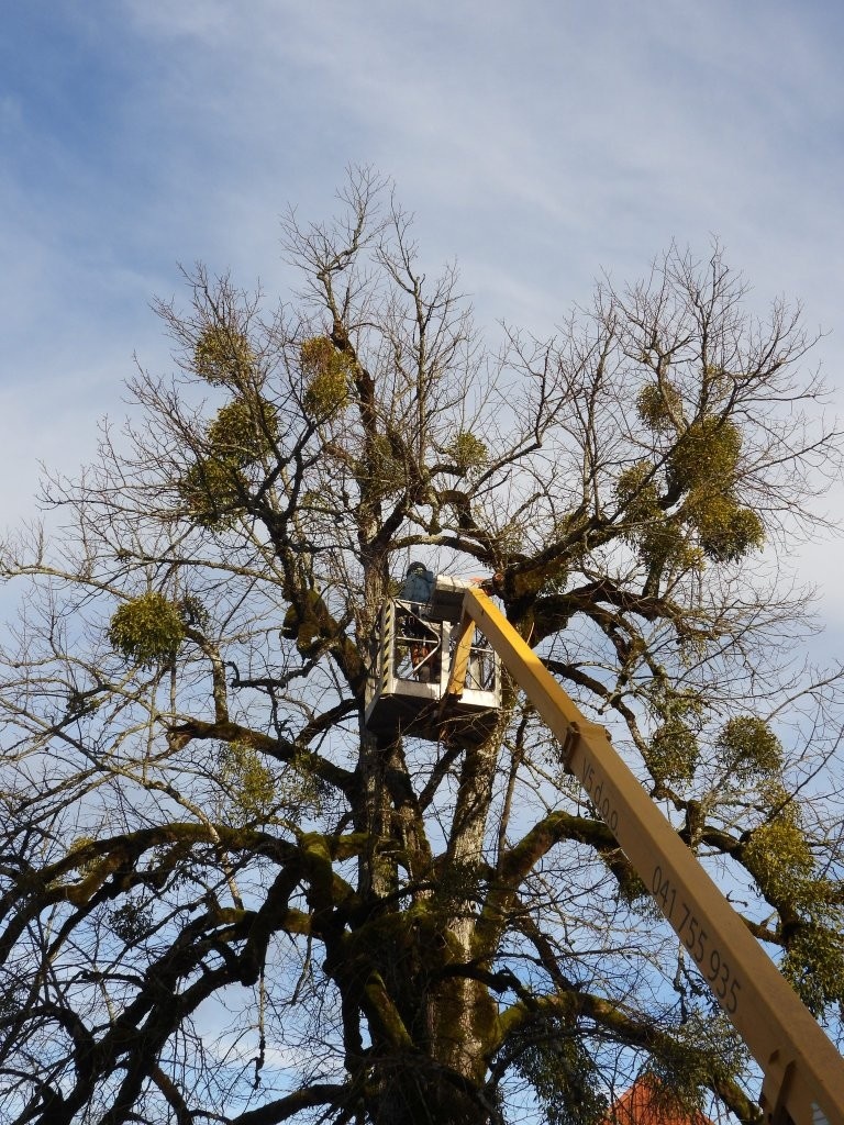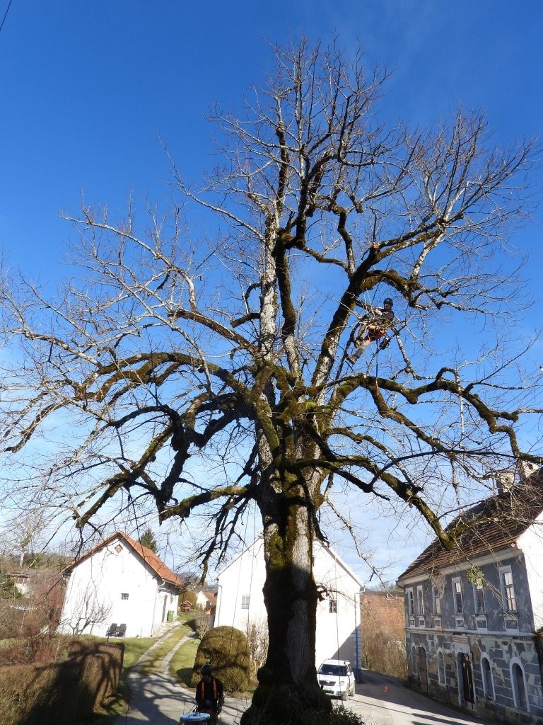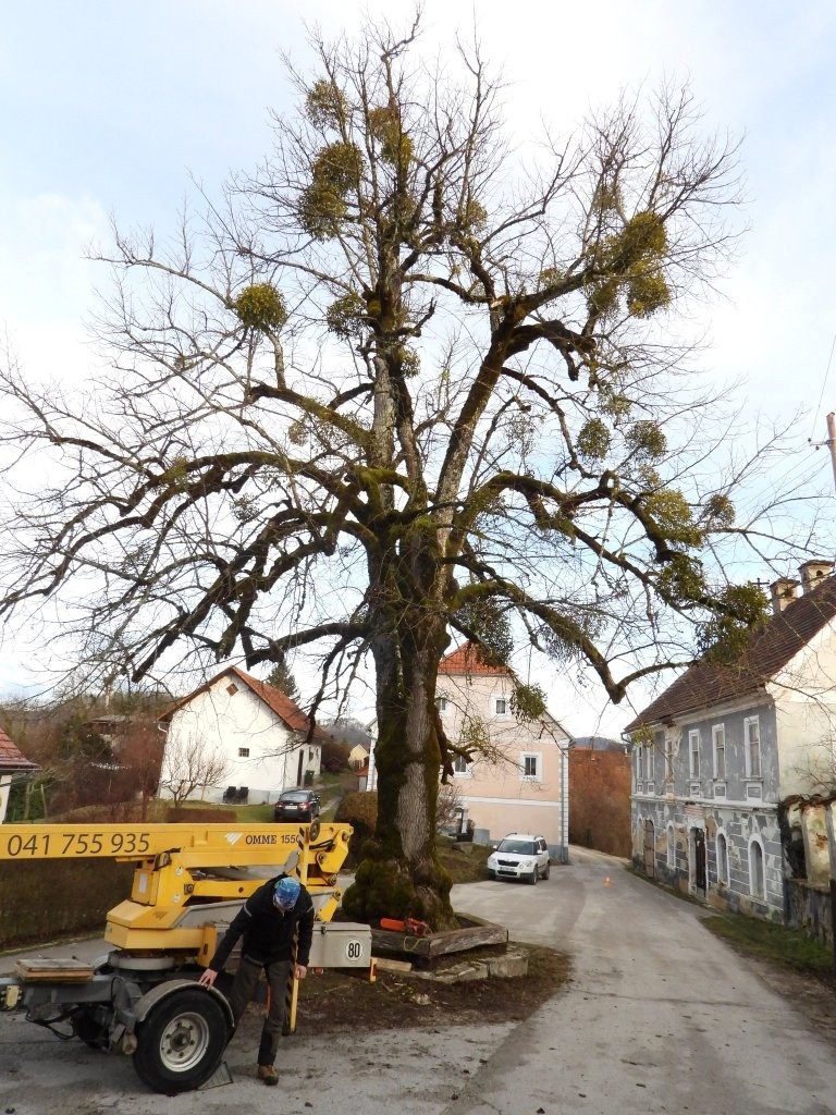 Optimalen čas za obrezovanje lip je sicer avgust, a tudi zimski čas mirovanja ustreza. Trije člani ekipe so se do bele omele in suhih vej prebijali na dva načina – z dvigalom in alpinističnim plezanjem. Vsi vrhunski alpinisti z veliko arborističnega znanja. Z orodjem za pasom so se ob pomoči vrvi prebijali iz veje na vejo, pod krošnjo je bilo na tleh vse več suhih vej in zelenih kroglastih omelinih grmičkov. In kljub zimskemu času zelene krošnje so postajale vse bolj takšne, kot se za lipo v zimskem času spodobi. Za večje drevo je bil potreben kar cel delovni dan, manjša lipa je bila »urejena« do časa kosila. Drugi dan obrezovanja so nas pobožali še sončni žarki, ki so na razbrazdano lubje privabili prebujene šuštarje (rdeče škratce). Votlo vejo pa si je kot potencialno gnezdilno duplo ogledoval plavček. Ob koncu je mimo priletel še prvi letošnji metulj – rumeno obarvan citronček.