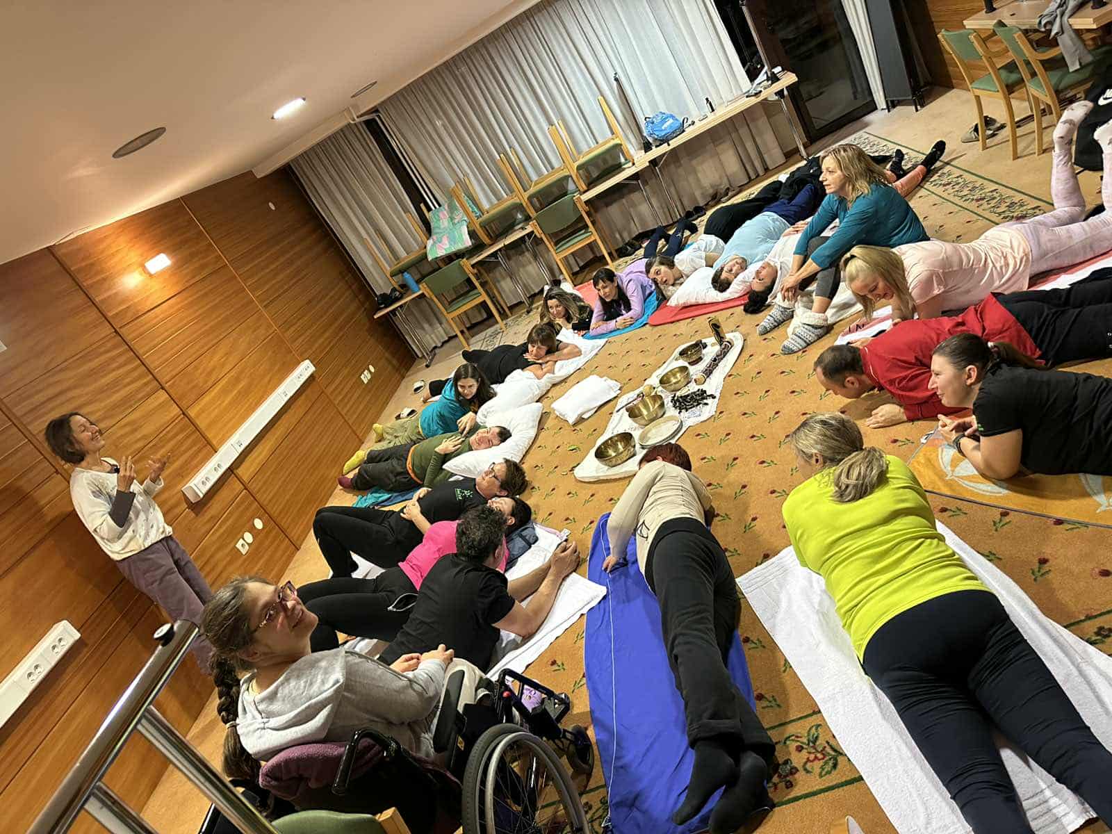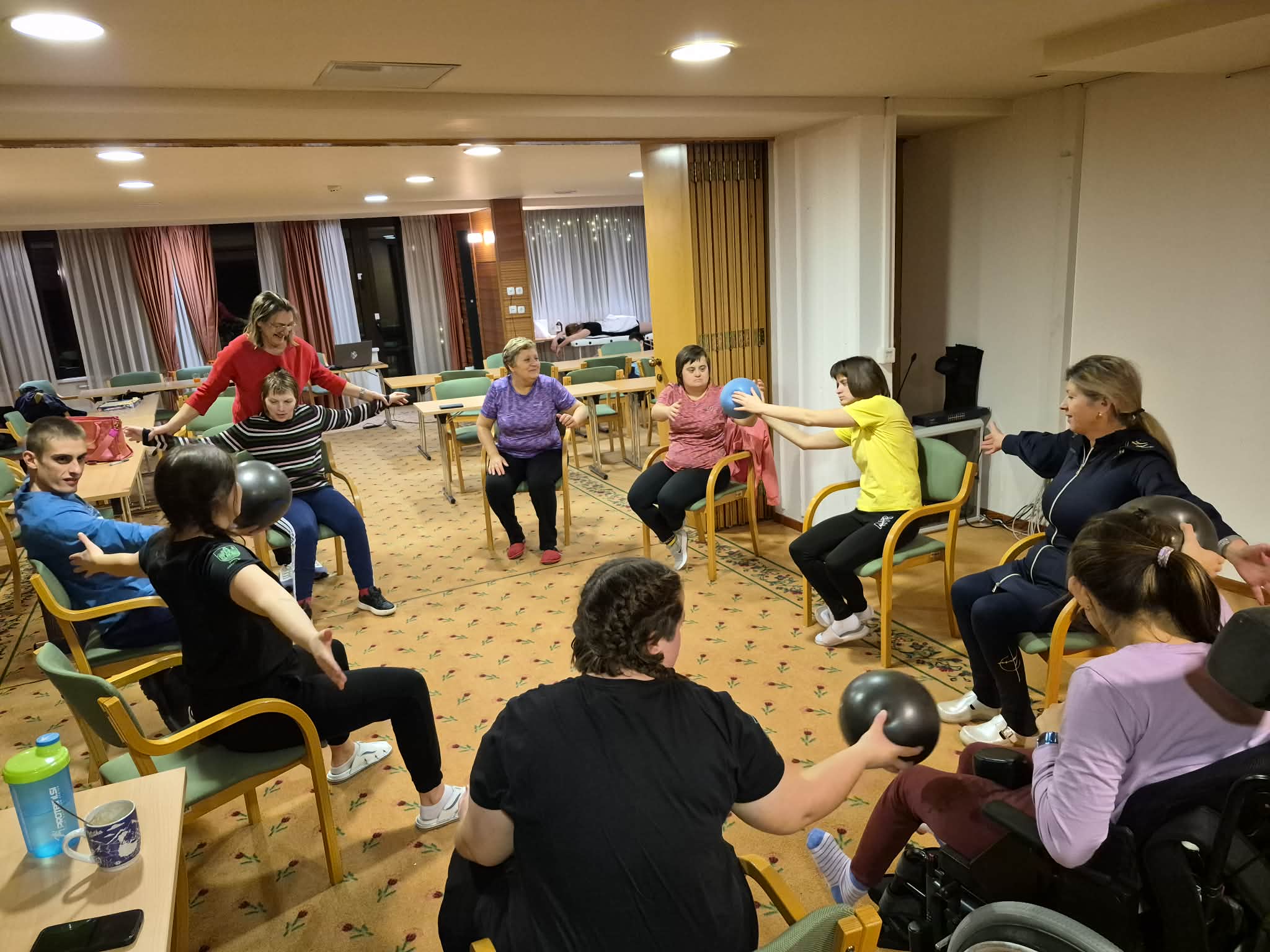 Za strokovne terapije so poskrbeli nevrofizioterapevt Tomaž Novak, kinezioterapevtka Tjaša Slak, maser Drago Butara in fizioterapevtska Tia Dobrin. Naš priljubljeni Jernej Brilej pa je izvajal terapijo z glasbenimi vilicami in skrbel za veselo vzdušje ob večerih. Da so vse aktivnosti potekale gladko sta ves čas skrbeli predsednica društva Nataša Solomun in njena desna roka Mateja Ivačič. Poleg smučanja in terapij smo koristno izkoristili preostale ure za igro na snegu, drsanje, sankanje, plavanje v hotelskem bazenu in obiskom fitnesa. Pridružili smo se gospe Sanji Kaštrun pri skupinski meditaciji z gongi. Sprehajali smo se do še vedno praznično okrašenega centra Kranjske Gore ter vse naprej do jezera Jasna. Večere smo preživljali skupaj, ob druženju, z glasbo in igrami ter gledanju filmov na platnu.