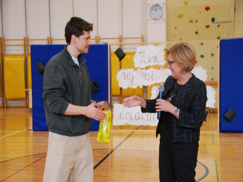 Pred njegovim prihodom so osmošolci in devetošolci deklamirali Prešernovega Povodnega moža in Zdravljico, plesalke pa so odplesale ples na naslovno skladbo serije Skrito v raju. Mladi igralec nam je predstavil svoje skrajno zanimivo življenje. Z igro se je prvič srečal pri štirih letih, ko je na predstavi dedka Mraza opazoval igralce na odru in njihovo igro. Že kot osnovnošolec je igral v filmu Gremo mi po svoje, ko pa je odrasel, je nastopil v številnih serijah in filmih, kot so Najini mostovi, Posledice, Gajin svet 2, Gospod profesor in v nam zelo znani seriji Skrito v raju.