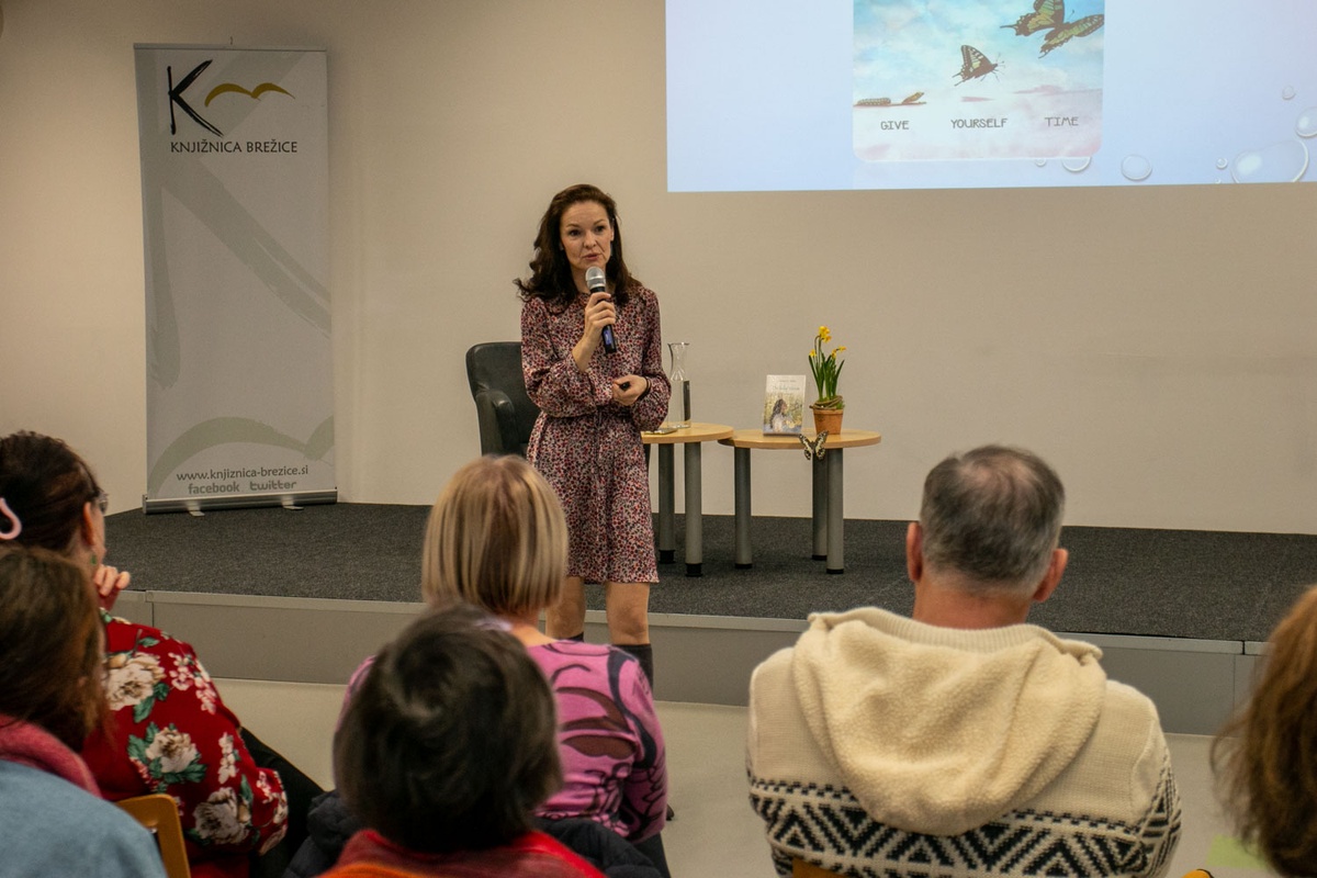 Nagovarja jo svet peska, puščave in raziskovanja daljnih kultur, skozi leta pa jo je potiho nagovarjal tudi pogovor o smrti. Za njo so leta srečevanj z zgodbami sogovornikov na Hospickafejih, katera ji je z notranjim nasmehom in zaupanjem predala njihova ustanoviteljica dr. Manca Košir. Njej in metulju – simbolu preobrazbe in večnosti – je namenjeno izročilo najnovejše knjige, vsebini katere smo prisluhnili zbrani v knjižnični dvorani.