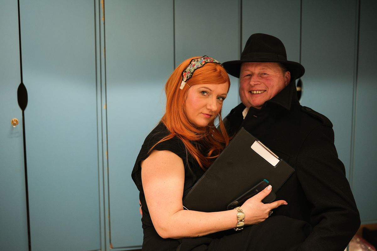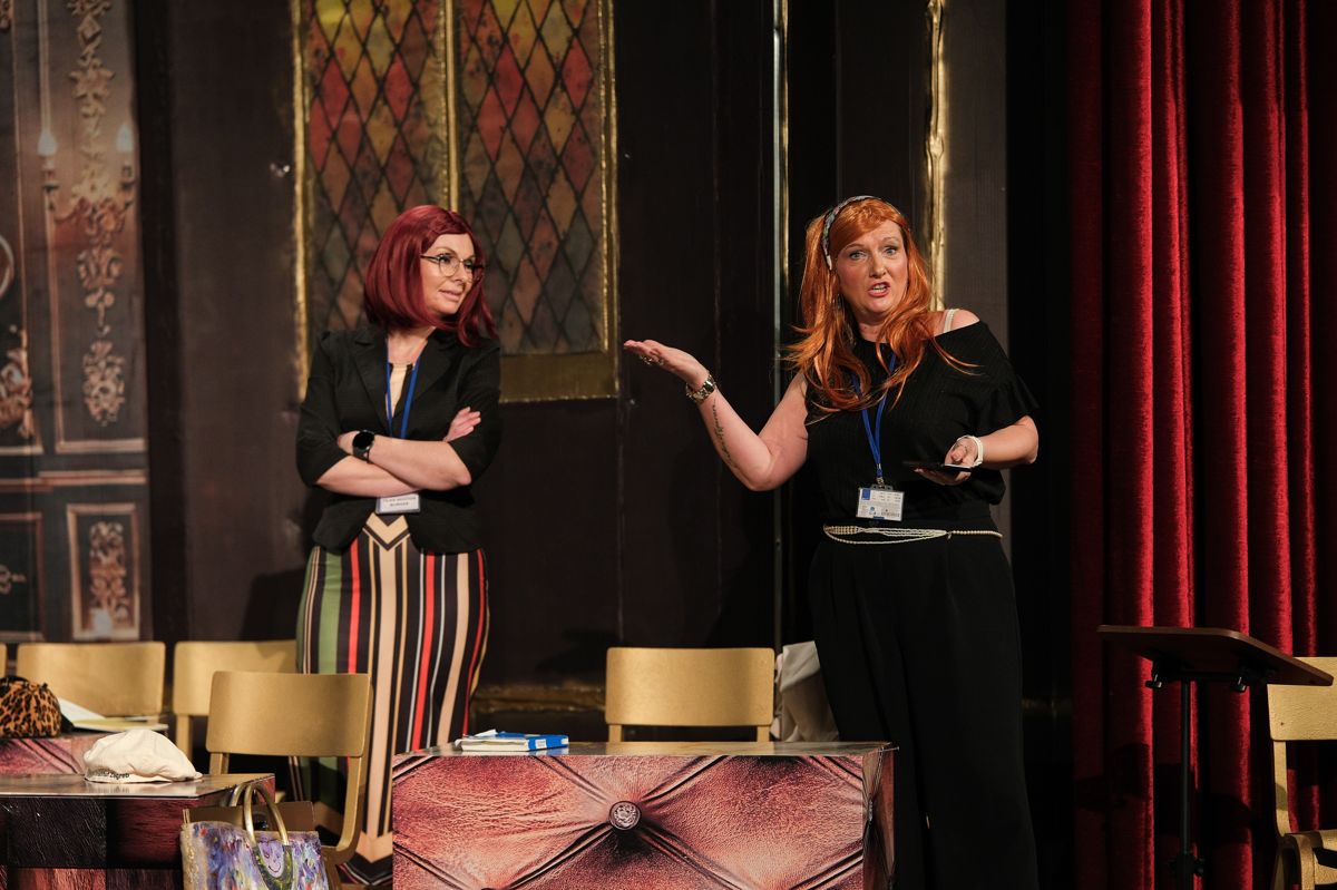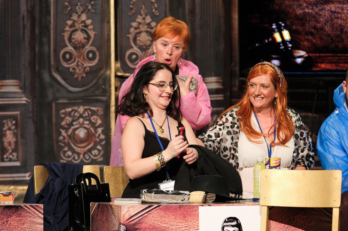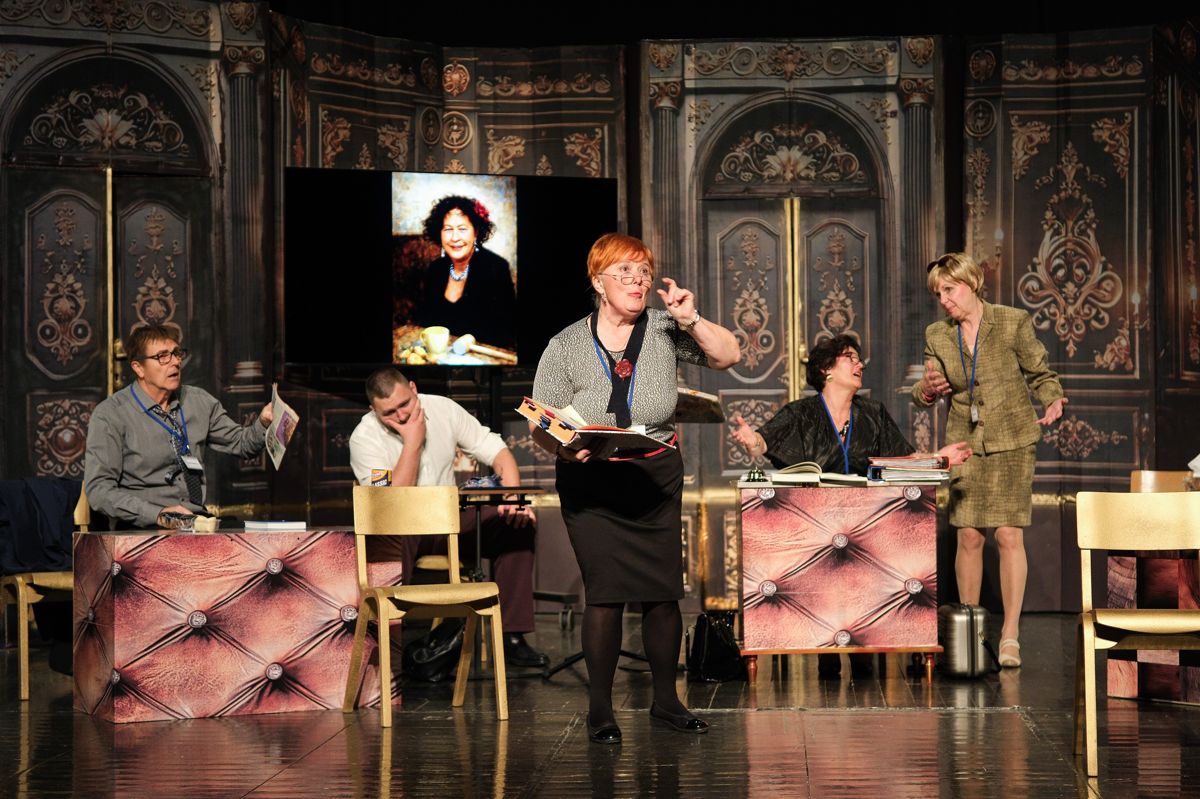 V predstavi nastopajo Milanka Hojnik (Ernestina Molk), Aleksandra Macur in Mojca Brilej Behin (Tilka Močnik Burger), Marjan Poznič (Živko Kregar), Alenka Poznič (Vera Kovač), Tilen Abram (Janez Novak), Tim Žveglič (Ljubo Cmer), Darja Boh (Žarka Smuk), Zvonko Marinič (Tinko Marinko), Kaja Žvar (Vladka Rop), Vlasta Moškon (Milojka Čuden), Branko Margon (Bine Rednik), Beba Urbančič (Berta), Darija Jesenšek in Marjana Abram (Silvija), Mirela Zalokar (Marija Jan), Anja Brilej Bohorč (Vanesa Palegrini) ter Boštjan Colarič (Erik Razkriva).