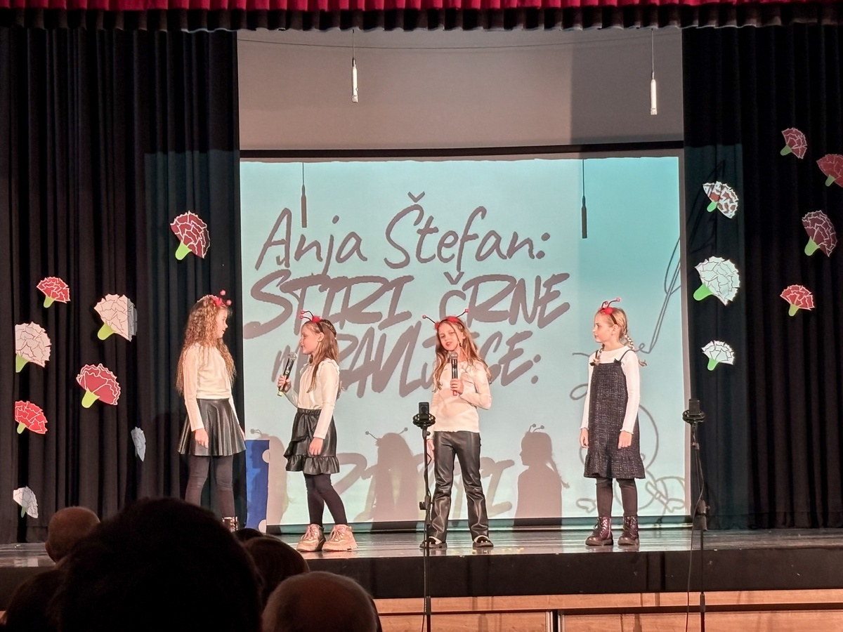 Tako smo spoznali 4 tretješolke, ki so se prelevile v 4 črne mravljice in kot povezovalni člen med točkami odigrale 4 kratke zgodbice iz knjige Anje Štefan, prvošolci in drugošolci so recitirali dela Anje Štefan in Ferija Lainščka, četrtošolci so pripravili zanimivo upodobitev Mojce Pokrajculje, petošolci so nadvse izvirno zrecitirali Rozmanovega Povodnega moža, podlago zanj so pred njimi dale osmošolke z originalom, sedmo- in osmošolke pa predstavo Prvi šolski ples, ki so jo obogatile s plesnimi vložki. Seveda ni manjkalo tudi glasbe, saj so se s prepletom ljudskih in umetnih pesmi predstavili vsi 3 zbori, ki delujejo na šoli, sam začetek in konec prireditve pa sta oznanili pevski točki, v katerih sta najprej pesem Moja dežela zapeli Kaja in Zara, na koncu pa še Zala krasno balado Mi, otroci morja.