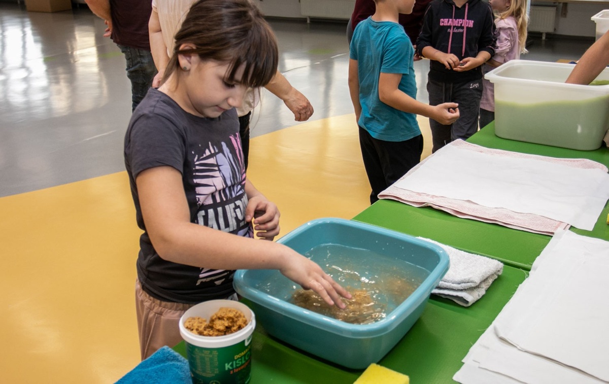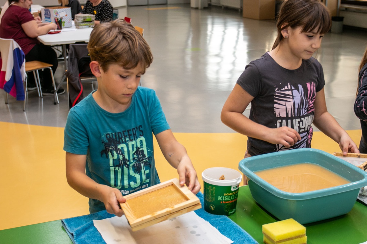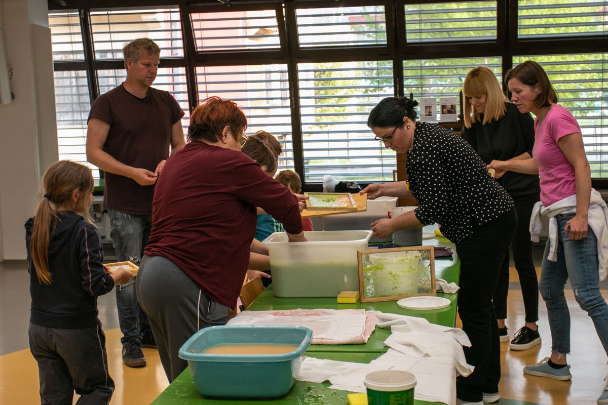 Na aprilskem srečanju so udeleženci naredili korak naprej. Iz enakih materialov, ob dodatni meri spretnosti in veliko dobre volje, so se preizkusili v izdelavi lastnega papirja. Ustvarjalni proces jih je tako navdušil, da pri enem poskusu niso ostali – papir so izdelovali znova in znova ter raziskovali različne možnosti oblikovanja.