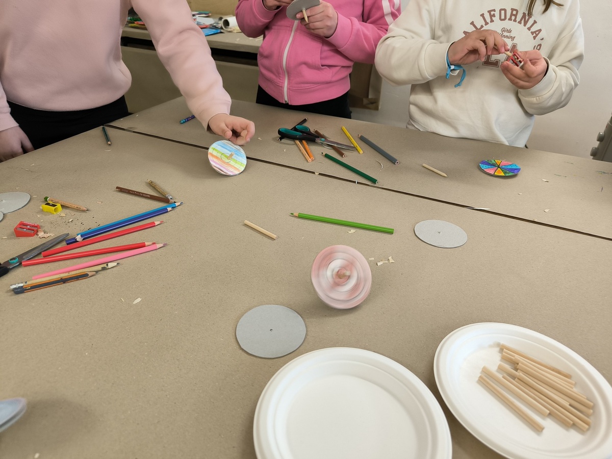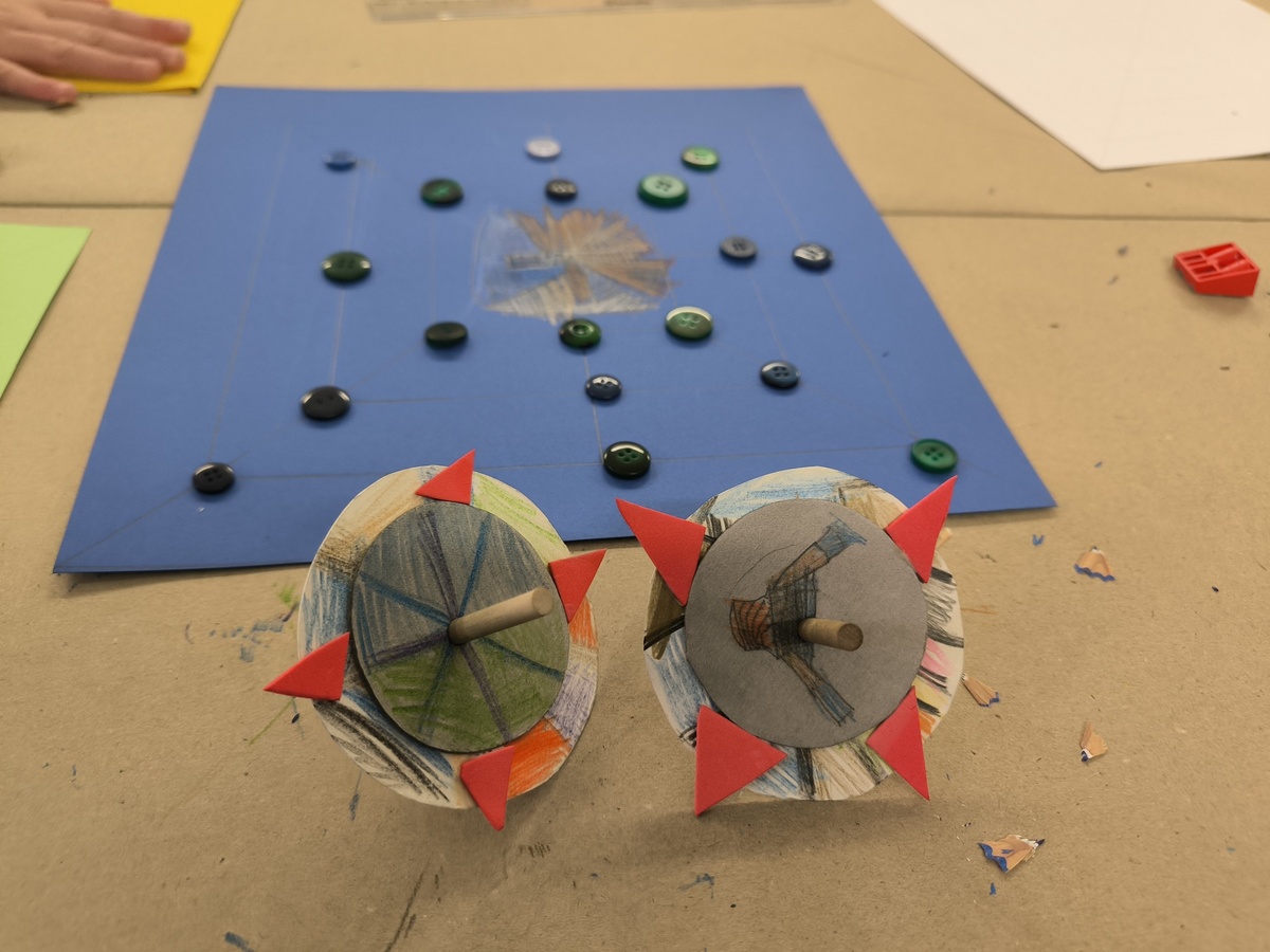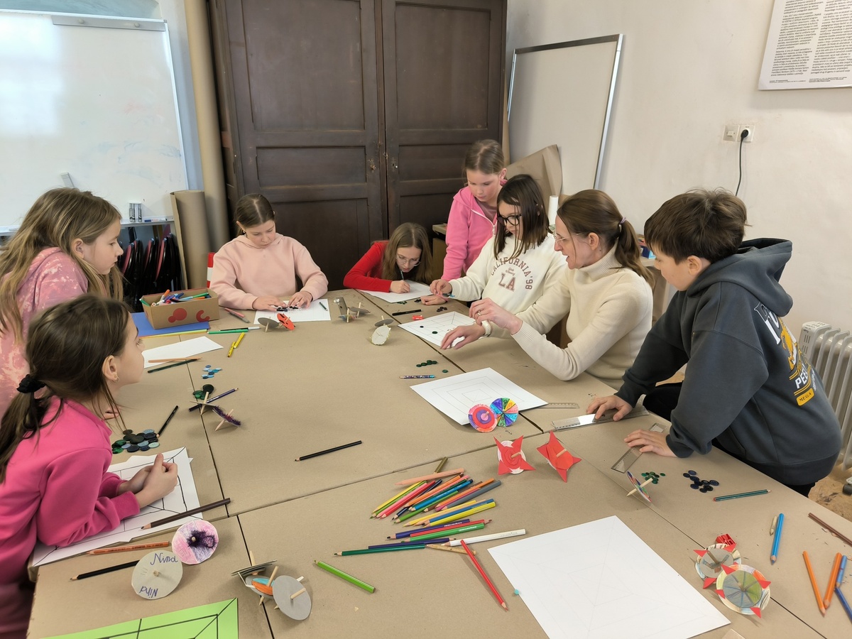 Na ustvarjalni delavnici so otroci izdelovali vrtavke in namizno igro mlin. Spoznali so, iz kakšnih materialov so bile igrače narejene nekoč ter kako delujejo. Z veliko mero natančnosti, domišljije in barv so nastajale unikatne vrtavke in lično oblikovane igralne plošče za mlin.