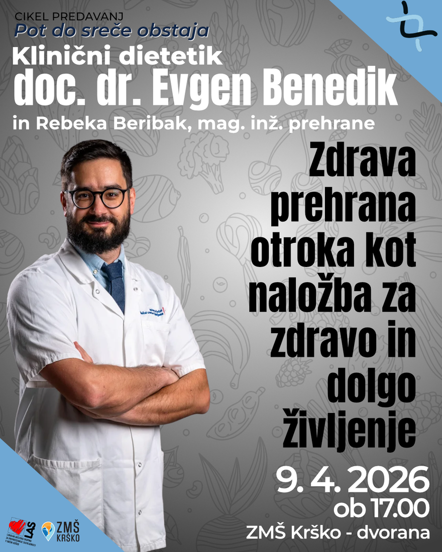 V okviru cikla predavanj Pot do sreče obstaja vas ZMŠ Krško vabi na predavanje Zdrava prehrana otroka kot naložba za zdravo in dolgo življenje, ki bo potekalo v četrtek, 9. aprila 2026, ob 17. uri v dvorani Zavoda za mladino in šport Krško.